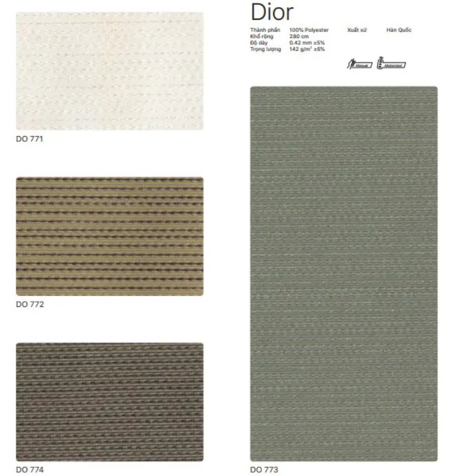 Phong cách tối giản hóa chính là phong cách mà Modero muốn hướng tới. Rèm Roman mã Dior này cũng vậy. Bảng màu gồm 4 mã màu như sau: DO771, DO772, DO773, DO774, trong đó màu DO773 - vàng đen là màu mang lại sự đặc trưng của rèm khi được đặt tên là Dior.