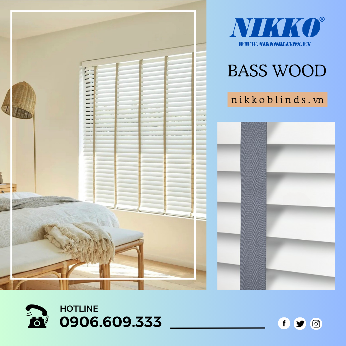 - Rèm gỗ BASS WOOD được làm từ gỗ tự nhiên có độ bền cao, thiết kế bề mặt nhẵn bóng với các đường vân gỗ nhẹ nhàng.